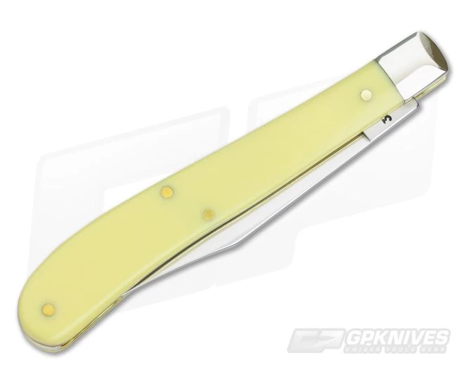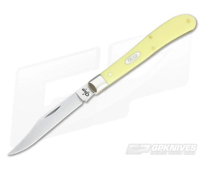 Case Barehead Slimline Trapper with yellow synthetic delrin handles and chrome vanadium carbon steel blade. Nail nick for easy opening of blade. Nickel silver bolster and brass liners.