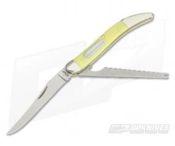 Case Fishing Knife with yellow synthetic delrin handles and Tru-Sharp stainless steel long clip and scaler blades. Clip disgorger and hook sharpener. Nail nicks for easy opening of blades. Nickel silver bolsters and brass liners.
