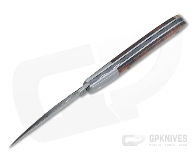 Blade:Â Hawes hand forged Damascus combines 160 layers of 1095 and L6 high carbon steels creating a unique Burl pattern. The Whittler-style Wharncliffe blade is opened with single nail nick and comes with a razor sharp convex grind. The straight edge and fine point are perfect for small wood working projects while the file work along the spine adds a custom feel. The blade opens with a pronounced half stop with strong Damascus back spring construction.