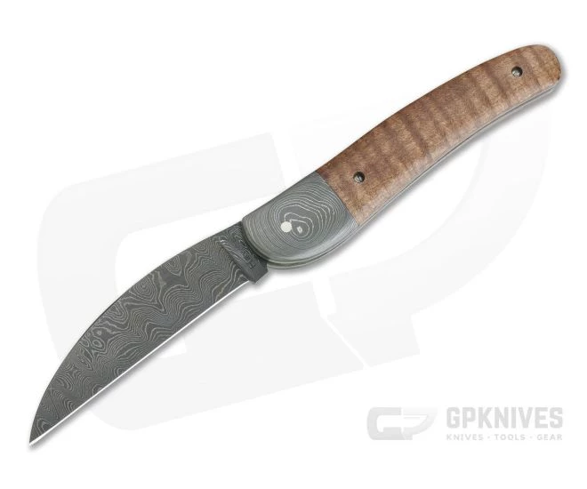 Blade:Â Hawes hand forged Damascus combines 180 layers of 1095 and 15n20 high carbon steels creating a unique, Modified Ladder pattern. With a clean, sans-nail nick design, the Whittler-style Wharncliffe blade is opened with a pinch grip and comes with a razor sharp convex grind. The straight edge and fine point are perfect for small wood working projects while the file work along the spine adds a custom feel. The blade opens with a pronounced half stop with strong Damascus back spring construction.