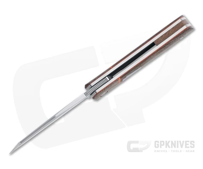 Handle: Traditional style executed with precision in a modern construction is the benchmark of a Pena custom. The sweeping modern lines of the Raptor are delivered with thick titanium liners supporting contoured Micarta covers over orange liners. This piece comes with rugged burlap Micarta for the covers with brown canvas bolsters separated by the same orange liner material and adorned with a satin finished stainless steel shield inlay on the front and matching Micarta partial back spacer. Simple, smooth and rock solid, the liner lock delivers secure lockup for safe use.