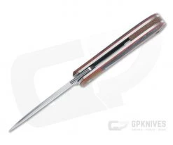Handle: Traditional style executed with precision in a modern construction is the benchmark of a Pena custom. The clean sweeping lines of the Zulu are delivered with thick titanium liners supporting contoured Micarta covers over red liners. This piece comes with Painted Desert G-Carta, a custom crosscut canvas Micarta, for the covers with brown crosscut Micarta bolsters separated by the same red liner material and adorned with a satin finished stainless steel shield inlay on the front and matching Micarta partial back spacer. Simple, smooth and rock solid, the liner lock delivers secure lockup for safe use.