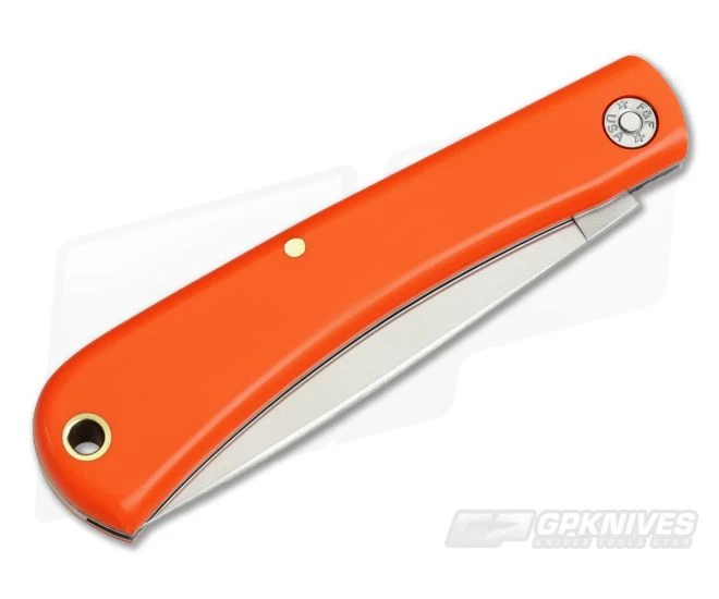 The Handle: Solid orange delrin handle scales are pinned to stainless steel liners for a smooth, comfortable feel in-hand. Includes brass lined hole for optional lanyard. These come in a unique tube packaging with company information on the front and is brand new direct from Great Eastern Cutlery.