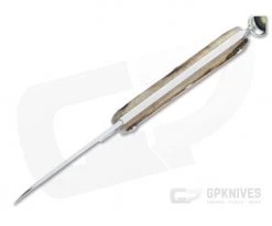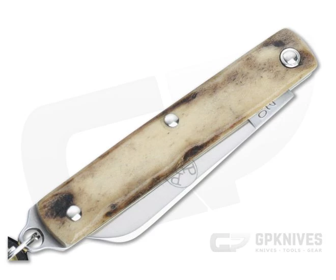 Handle: Built with traditional brass liner and pin construction, the compact handle has rugged Sambar Stag covers sans shield to showcase the natural texture. The handle offers a solid three finger grip with an extended hole milled back spring for keychain or lanyard attachment. The full length back spring protects the blade when closed and delivers classic slip joint operation.