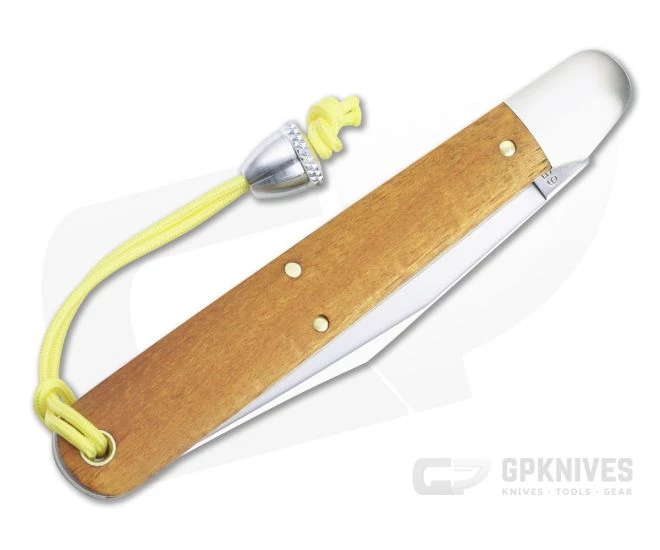 Handle: Fit perfectly to brushed nickel silver bolsters are handsome Osage orange wood covers, delivering a generous handle with a gentle taper toward the blade and subtle index guard. Construction is classic brass liner and pin with a strong stainless steel back spring for secure slip joint operation. A nylon lanyard with acorn bead comes attached. Each GEC knife ships in a sturdy tube with company information on the front.