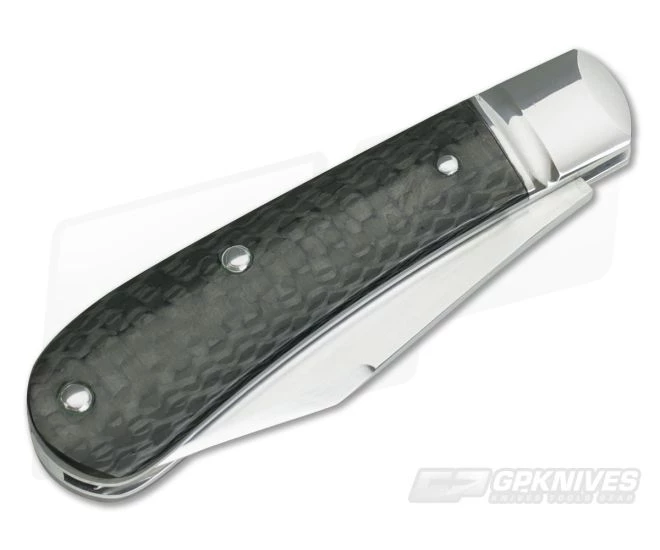 The Handle:Â Striking Carbon Fiber scales have a smooth, polished finish and subtle contouring for in-hand comfort. The scales are fit perfectly to stainless steel liners with 416 stainless steel pinned construction with polished stainless bolsters and a rectangular shield. The bolsters display a groove embellishment that further elevates this beautiful piece. The compact size of the #125 makes is a perfect choice for fifth pocket carry as a Gentleman’s knife.
