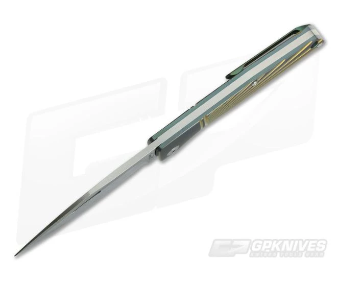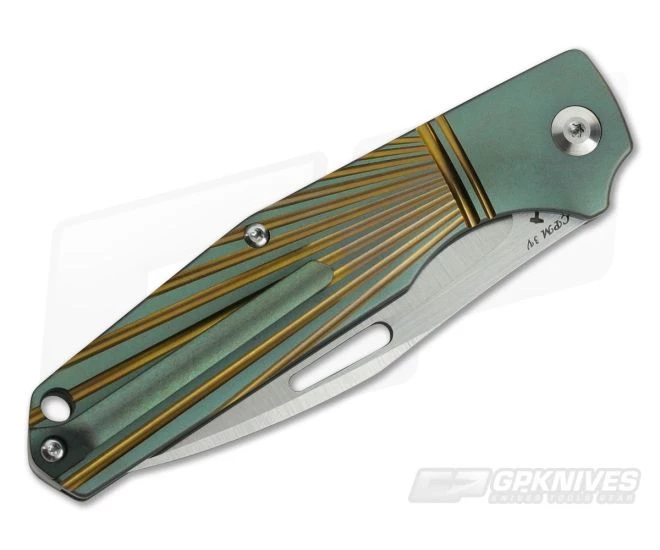 Handle:Â The full titanium handles are clean and ergonomic with a generous index guard, integral faux “bolsters” and a gorgeous Ray milling with a two tone finish: tumbled green over gold with polished gold anodized grooves. Internally milled pockets significantly reduce weight with no sacrifice in strength. The stainless steel back spring delivers a snappy action opening and closing and a generous hole is included for lanyard attachment.