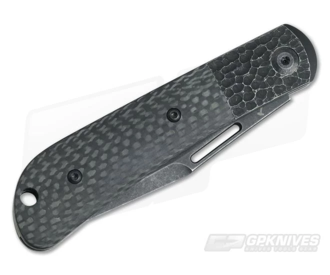 The Handle:Â The handles offer burly, jigged Titanium bolsters with integral titanium liners and contoured Carbon Fiber handle scales. A large Torx pivot and two Torx screws secure the handles together with a beefy, stainless steel back spring for secure and snappy operation. The bolsters and liners have a tumbled black coated finish for a rugged, subdued look. The back spring has a matching black tumbled finish that, along with the Carbon Fiber scales, makes this piece very discreet for carry and use. A large hole is provided for lanyard attachment.