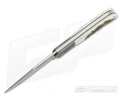 The Handle:Â The handles offer burly, jigged Titanium bolsters with integral titanium liners contoured Stag handle scales. A large Torx pivot and two Torx screws secure the handles together with a beefy, stainless steel back spring for secure and snappy operation. The bolsters, liners and pivot hardware have a rugged tumbled finish that goes great with the Stag handles while the back spring is satin finished for a touch of class. A large hole is provided for lanyard attachment.
