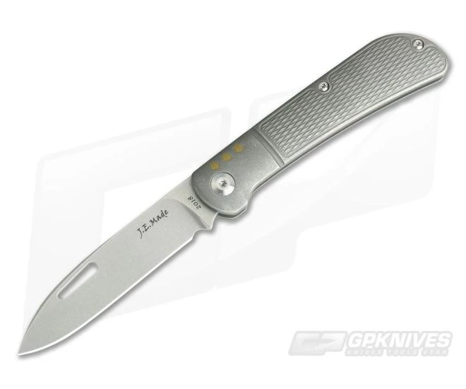 JE Made Knives executes the Tribal Spear or Zulu pattern in his own iconically modern style. This knife has exceptional fit and finish, snappy walk and talk and delivers a modern traditional profile that is robust and ready for some serious use. This version comes with bolstered and diamond textured titanium handles with 3 brass inserts, a stonewashed blade and 3D Machined Titanium Pocket Clip.