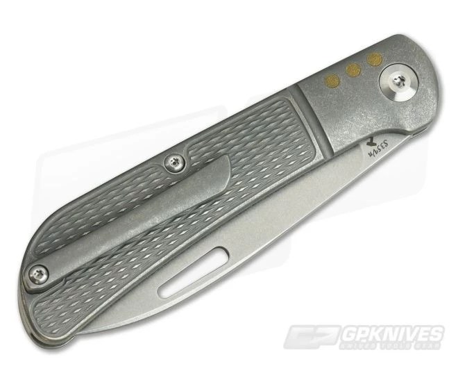 Handle:Â The full titanium handles are clean and ergonomic with a subtle dual guard and contoured shape for comfort. The handles are milled with smooth integral bolsters that have three brass inserts for a subtle touch of color. A classic diamond texture milling is used in place of traditional covers. The whole handle is finished with a matte grey blast and tumble finish. The stainless steel back spring delivers a snappy action opening and closing and an inline pin is included for lanyard attachment.