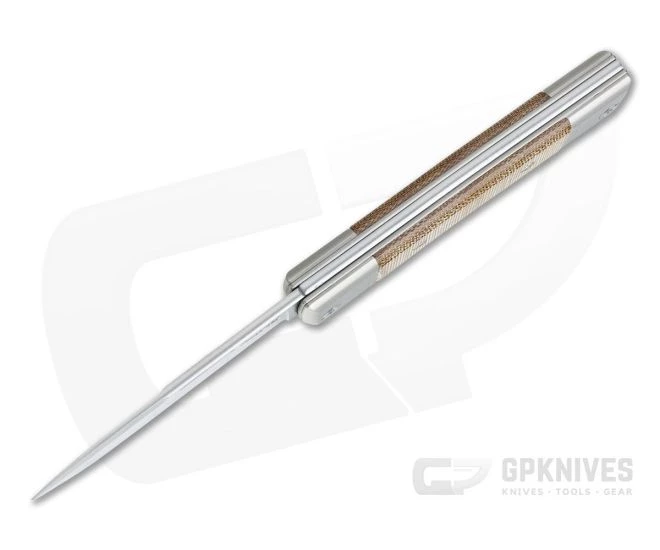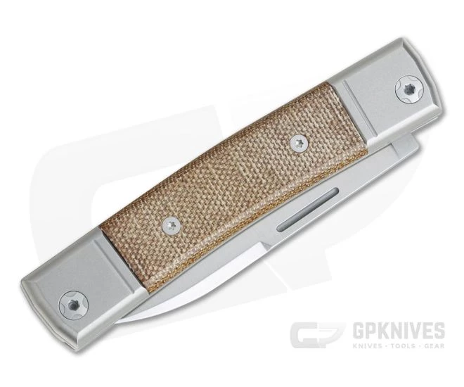 Handle:Â Crowned titanium liners support beautiful handles with scales of Natural Canvas Micarta framed by grooved titanium bolsters at both ends. The back-spring is crowned along with the chamfered scales and bolsters making this knife very comfortable in the hand. The moderate back spring tension delivers smooth pull with snappy half and full stops for secure use.