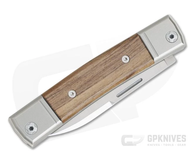 Handle:Â Crowned titanium liners support beautiful handles with scales of Santos Wood framed by grooved titanium bolsters at both ends. The back-spring is crowned along with the chamfered scales and bolsters making this knife very comfortable in the hand. The moderate back spring tension delivers smooth pull with snappy half and full stops for secure use.