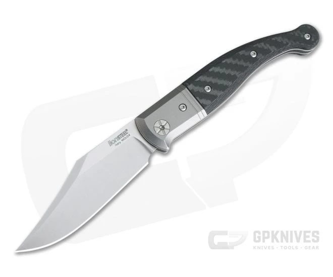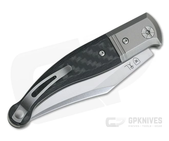 Handle:Â The Navaja-inspired design has a similar sweeping handle with titanium bolstered Carbon Fiber scales supported by crowned titanium liners. The back-spring is crowned and, along with the chamfered scales and bolsters, offer a very comfortable feel in the hand. The tapering handle provides a solid and secure grip while a subtle index guard provides some added safety. The moderate back spring tension delivers smooth pull with snappy half and full stops for secure use.