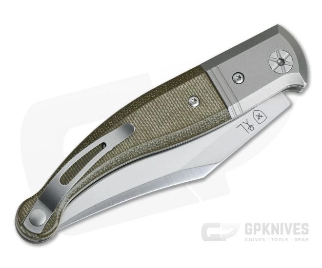Handle:Â The Navaja-inspired design has a similar sweeping handle with titanium bolstered Green Canvas Micarta scales supported by crowned titanium liners. The back-spring is crowned and, along with the chamfered scales and bolsters, offer a very comfortable feel in the hand. The tapering handle provides a solid and secure grip while a subtle index guard provides some added safety. The moderate back spring tension delivers smooth pull with snappy half and full stops for secure use.