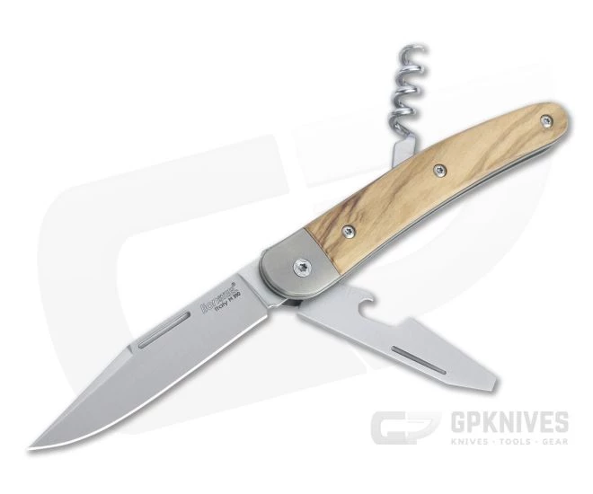 The Jack from LionSteel seamlessly blends modern construction and materials with traditional design with precision fit and finish. This traditional style slip joint is built on a titanium liner framework with titanium bolsters and hardware and a satin finished M390 stainless steel blade. This three blade version comes with Olive wood handle scales, screwdriver/cap lifter and corkscrew.