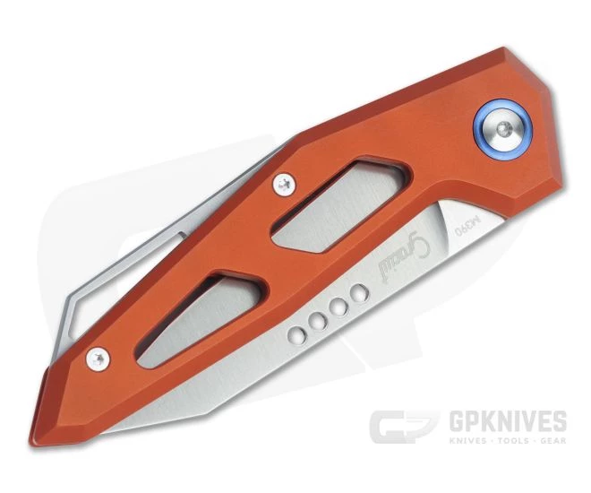 Handle:Â Dual slabs of anodized aluminum are chamfered for an ergonomic grip on the milled handle. Angular milled windows give a nice visual appeal and traction in the hand that pairs with the integral guard for a safe, secure grip. The proud back spring has a similar milled hole for lanyard attachment and is crowned for comfort and style. Stainless hardware and a blue anodized pivot collar complete the construction.