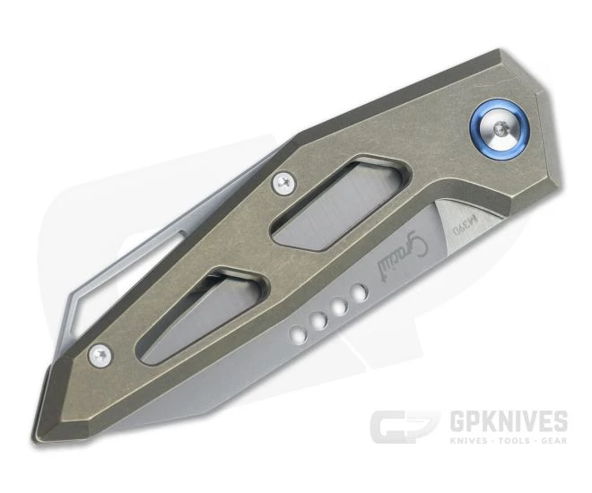 Handle:Â Dual slabs of titanium are chamfered for an ergonomic grip on the milled handle. Titanium delivers a nice heft in the hand while the rugged stonewashed bronze anodized finish offers visual appeal. Angular milled windows give a nice visual appeal and traction in the hand that pairs with the integral guard for a safe, secure grip. The proud back spring has a similar milled hole for lanyard attachment and is crowned for comfort and style. Stainless hardware and a blue anodized pivot collar complete the construction.