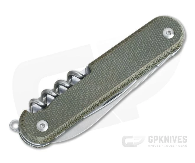 Handle:Â A simple oblong handle houses the stainless steel tools and blade with in stainless steel liners that support the removable scales. This version has handsome Green Canvas Micarta that offer a warm feel in the hand and good traction. Micarta is durable and weather resistant with a rustic look that fits well with this classic tool. Scales are attached via stainless Torx screws and are easily removed with the included T6/T8 Torx key for cleaning and maintenance. A stainless loop is provided for lanyard attachment.