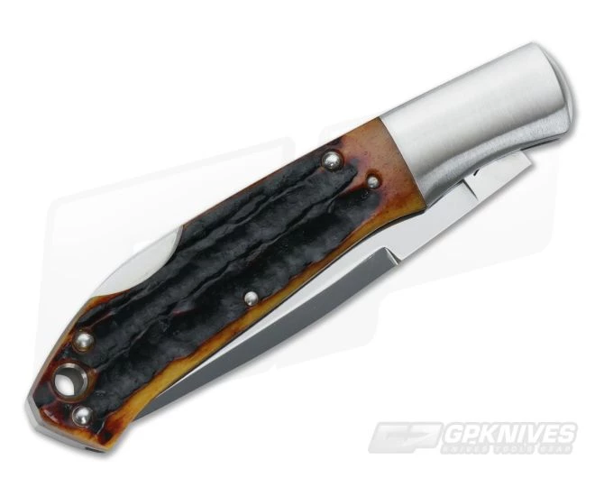 The Medium Moki Kronos Lockback features a VG-10 blade that has been beautifully mirror polished and has a nail nick for easy opening. The blade also has a talon swedge which gives it a sleek modern look. It locks open for secure and safe use and can be easily closed by disengaging the lockback. The vibrant amber stag bone handle has been pinned to brushed stainless steel liners and meets seamlessly with the brushed stainless steel bolsters. Includes canvas sheath with leather liner and button closure with belt loop for carry.