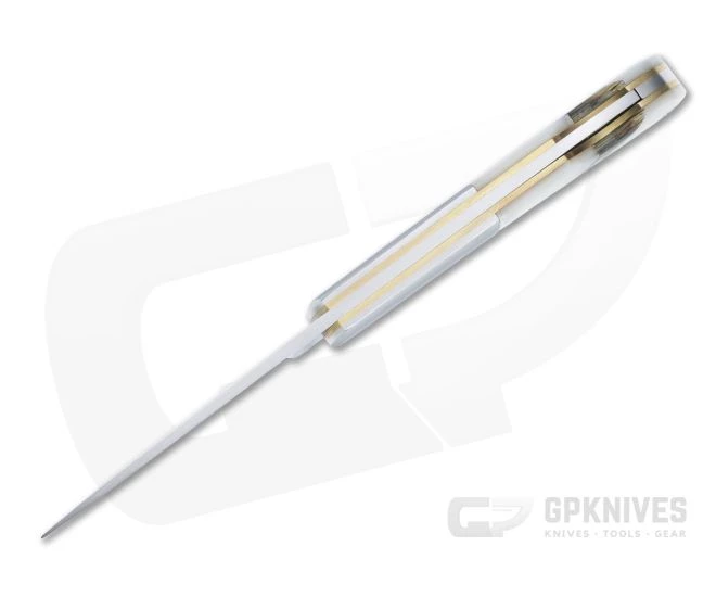 Handle: Traditional brass liner construction supports long, handsome brushed stainless steel bolsters atop beautiful mother-of-pearl covers with abalone chevron ‘arrow’ inlays. The simple back lock construction is seamless and smooth in operation for reliable lockup and secure use. This small design is ideal for shirt or watch pocket carry. A tube is provided for lanyard attachment.