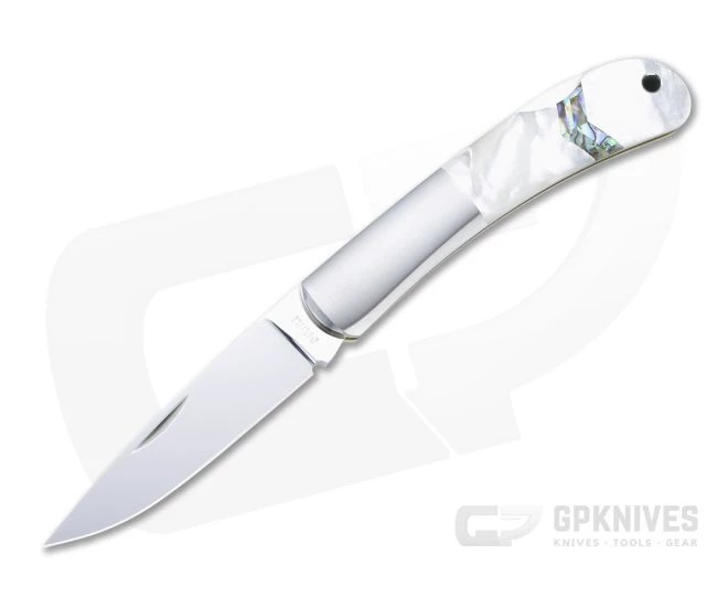 Handle: Traditional brass liner construction supports long, handsome brushed stainless steel bolsters atop beautiful mother-of-pearl covers with abalone chevron ‘arrow’ inlays. The simple back lock construction is seamless and smooth in operation for reliable lockup and secure use. A tube is provided for lanyard attachment.