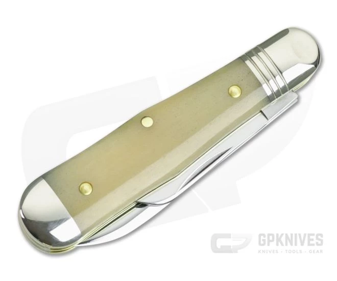 Handle:Â Construction of the wee lad is reminiscent of a cool glass bottle with back spring, brass liners and pins. Carefully rounded and smooth, this one is dressed in Smooth White Bone that is appealing both visually and in the hand. Rounding out the construction is a Small Badge shield and dual, polished nickel silver bolsters, pinched and grooved and the primary end. The Pemberton is sure to be a favorite for users and collectors alike.