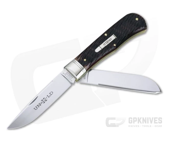 The #23 from Great Eastern Cutlery is the GEC version of a classic two-blade trapper. Instead of the traditional blade profiles Great Eastern has opted to go with a drop point Skinner paired with a hefty Spey blade. With a full size handle and dual, polished 1095 carbon steel blades this Trapper is ready to handle your heavy use tasks. This Northfield UN-X-LD “Bullet” version comes with polished blades, bolsters with Redtail Jigged Bone covers and Bullet UN-X-LD shield.