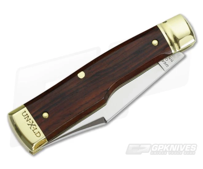The Handle:Â Also known as a traditional Gunstock pattern as its handle in whole resembles that of a rifle stock. Visually appealing and comfortable in hand on this timeless design. Shaped and smoothed cocobolo has a light to dark earth brown look to it with accented brass bolsters (one striped, one stamped UN-X-LD), pins and liners. Making its debut is the brass .44-77 Cartridge Shield putting a stamp on this Gunstock.Â