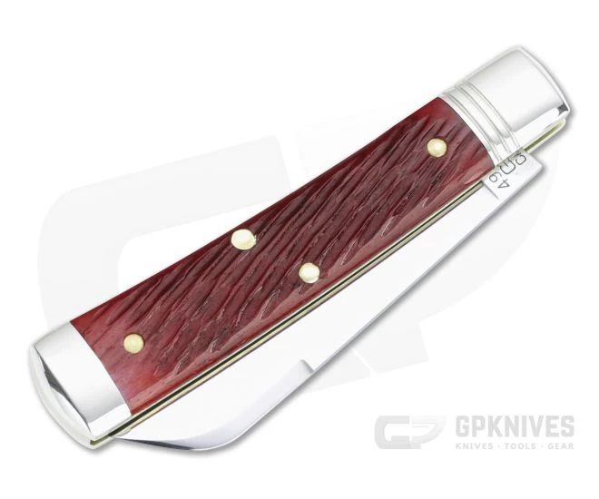 Handle: Fit perfectly between polished and grooved nickel silver bolsters are garnet red jigged bone covers delivering timeless style and rustic, tactile feel. Construction is classic brass liner and pin with a strong stainless steel back spring for secure slip joint operation. Each GEC knife ships rolled in wax paper in a sturdy tube with company information on the front.Â