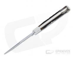 Handle: Built with traditional brass liner and pin construction, the compact handle sports “Dark Brewed” jigged bone covers, polished and grooved nickel silver bolsters and matching Orleans shield. The handle offers a solid grip and has a hollow brass pin for lanyard attachment. The full length back spring protects the blade when closed and forms the lock back mechanism for safe, secure use.