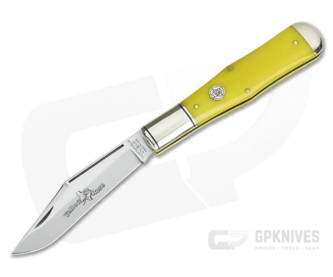 Handle:Â Construction of this beefy piece is reminiscent of a classic glass soda bottle with back spring, brass liners and pins. This one is dressed in classic Yellow Rose with a naturally pleasing look and feel that is sure to be a hit. Polished nickel silver finishes out the construction in style with dual, double grooved bolsters (twin striped primary).