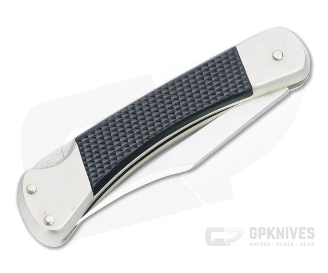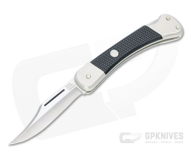 This vintage Puma Sergeant back lock folding knife has a satin finished stainless steel blade, aluminum liners with integral bolsters and black diamond checkered polymer covers. Knife only. No box.