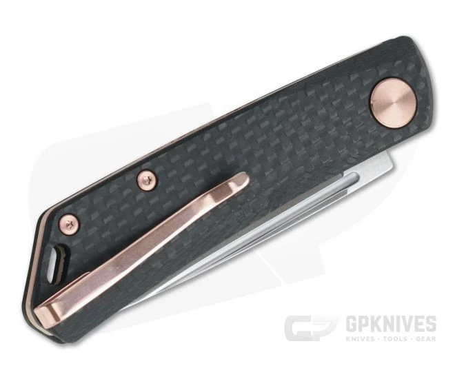 Handle:Â Carbon fiber slabs are machined with deep chamfers for a comfortable, contoured feel in the hand while providing a stylish and classy look for dress carry. Construction is simple with the stainless back spring and Torx hardware creating a solid, ultra lightweight platform for daily carry with added style from the rose gold PVD finish. A generous oval hole at the pommel end allows for lanyard attachment.
