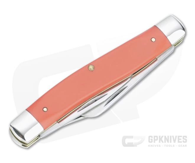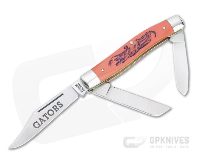 This vintage Schrade Stockman 505 features satin, flat ground carbon steel blades in the classic Stockman trio: clip, spey and sheepsfoot. The main clip blade has “Gators” etch. This version comes with blue scrimshaw “Florida Gators” orange Delrin handles over brass liners with nickel silver bolsters. Knife and box.