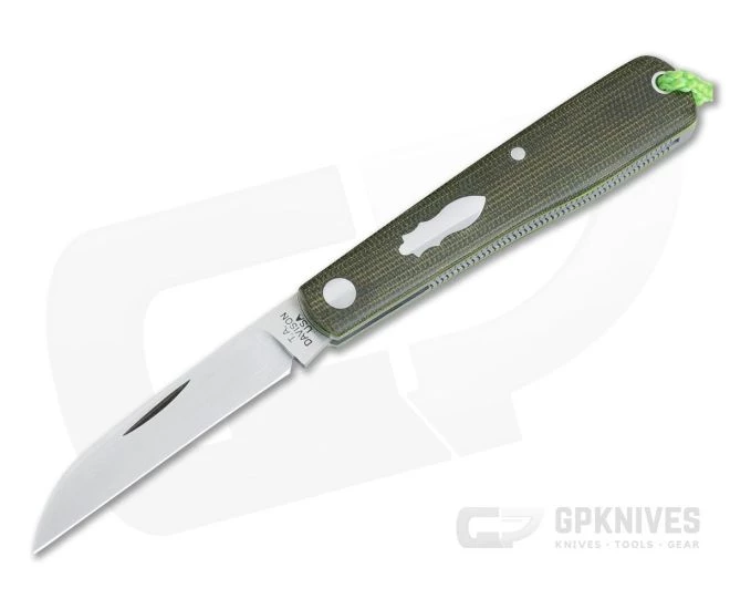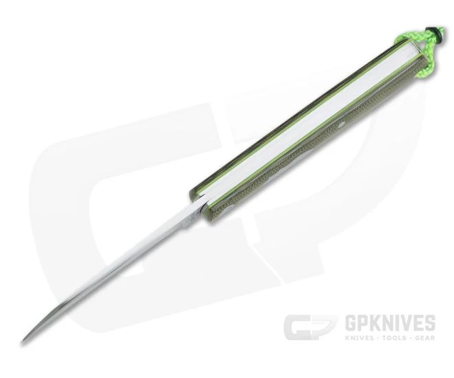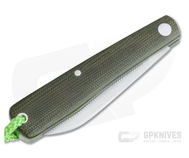 Handle: Â Rugged yet stylish Green Canvas Micarta covers are fit to the stainless steel liners with matching, polished stainless pins with striking Toxic Green G10 liners between. Delivering a truly custom feel the blade side liners of the Barlow-style handle have a coined edge with added file work on the inside of the back spring. Stainless pins are used to secure the covers and the display side has a stainless shield for a timeless feel. The back spring is smooth and solid with half-stop action and sits flush in all three positions. A matching Toxic Green lanyard is attached though the hollow stainless pin for added convenience.