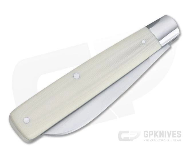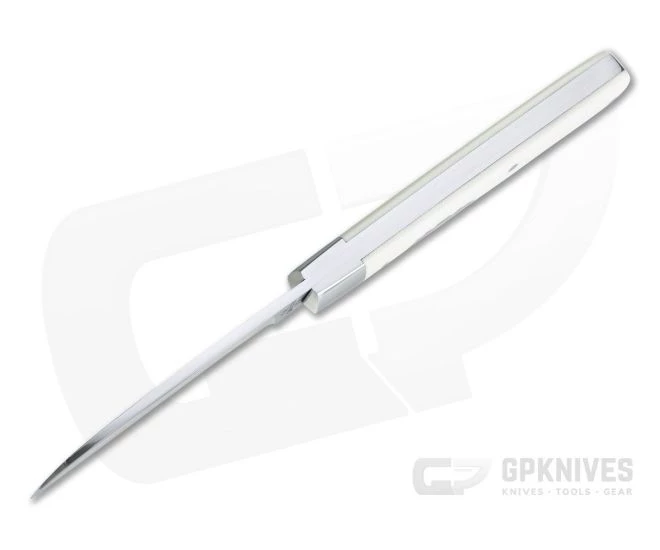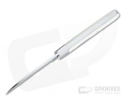Handle: Â Handsome and rugged Ivory White G10 covers are precision fit to the stainless steel liners and polished stainless bolsters. Flush fit, the liners are satin finished with file work on the inside of the back spring for a truly custom feel. Stainless pins are used to secure the covers and the display side has a stainless bow tie shield for a timeless feel. The back spring is smooth and solid with half-stop action and sits flush in all three positions.