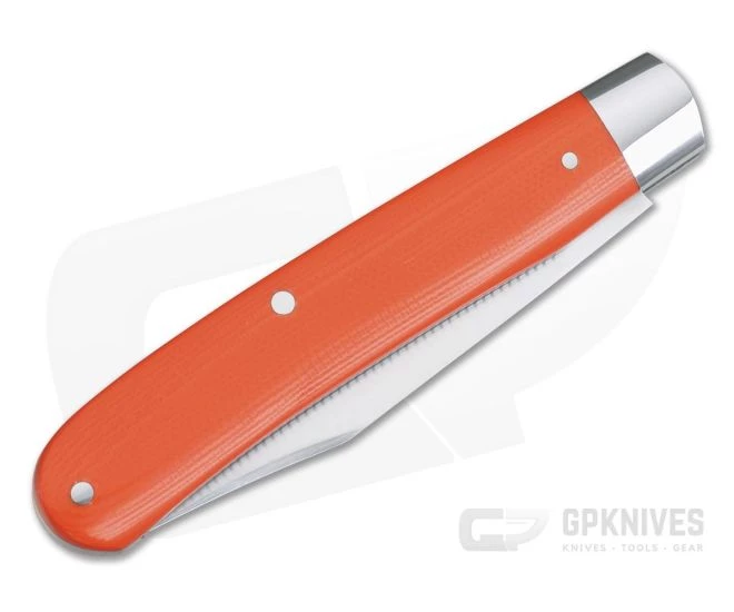 Todd Davison provides custom, traditional slipjoint pocket knives that are truly handmade and one of a kind. Having produced over 1600 slip joint knives, Davison utilizes premium materials and offers exceptional quality and attention to detail in a timeless, traditional design. This version comes with hand rubbed satin, CPM154 clip point blade, liners and bolsters with polished Orange G10 covers.