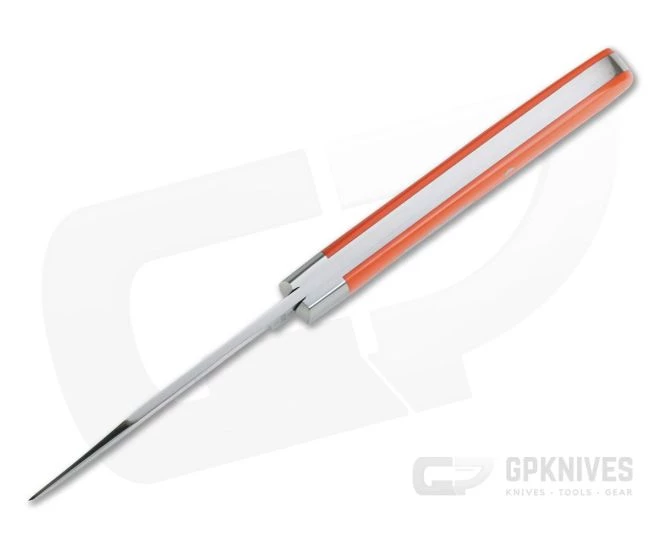 Handle: Â Smooth, stylish Orange G10 covers are fit to polished stainless steel bolsters which are precision fit to the stainless steel liners. Delivering a truly custom feel the blade side liners have a coined edge with added file work on the inside of the back spring. Stainless pins are used to secure the covers and the display side has a stainless propeller shield for a timeless feel. The back spring is smooth and solid with half-stop action and sits flush in all three positions.
