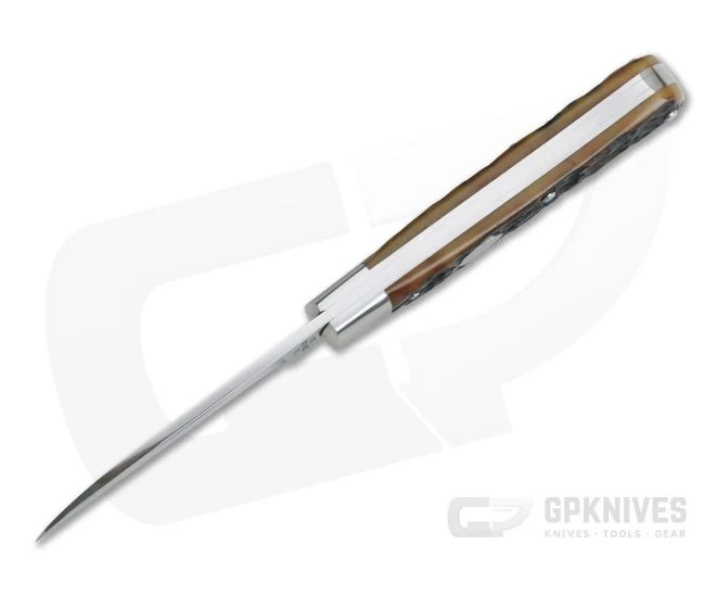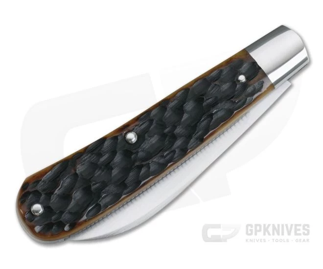 Handle:Â Handsome and rugged Dark Brown Jigged Bone covers are fit between polished stainless steel bolsters, precision fit to the stainless steel liners. Custom details included embellished, coin edge liners and internal file work on the back spring. Stainless pins are used to secure the covers and the display side has a polished stainless Acorn shield for a classic feel. The back spring is smooth and snappy with a strong half-stop.