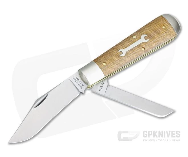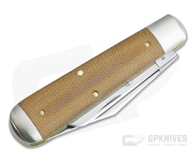 The #86 Oil Field Jack from Great Eastern Cutlery has a timeless look and classic feel that fits just right in the hand and the pocket. Brushed shield and bolsters add a touch of class while the straight handle and dual satin blades are all business. This Tidioute version comes with Natural Canvas Micarta covers and Wrench shield. This one is marked with the “PPP” distinction on the pen blade for “Pattern Production Premiere”.
