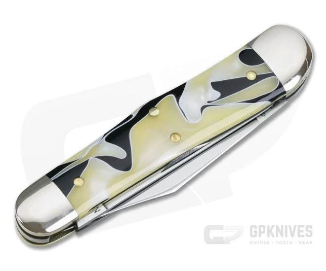 Handle:Â Grits with Butter and Molasses Acrylic handle scales are fitted perfectly between two nickel silver bolsters. The pattern is eye catching and stylish. All nickel silver is polished on the #29 including the Hotdog Shield. Brass liners and pins round out construction.