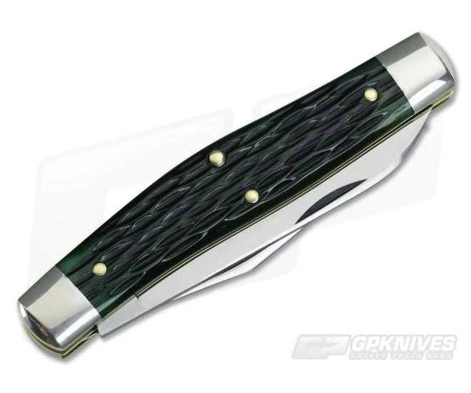 The Handle:Â Your classic bone handle scales have a jigged pattern adding texture for grip. GEC has applied a dark, black to forest green coloring to the scales creating a handsome appearance. Outfitted with nickel silver bolsters, brass liners and pins for top notch fit ‘n finish construction. A flush Tidioute shield is attached to the front of each as a final touch.