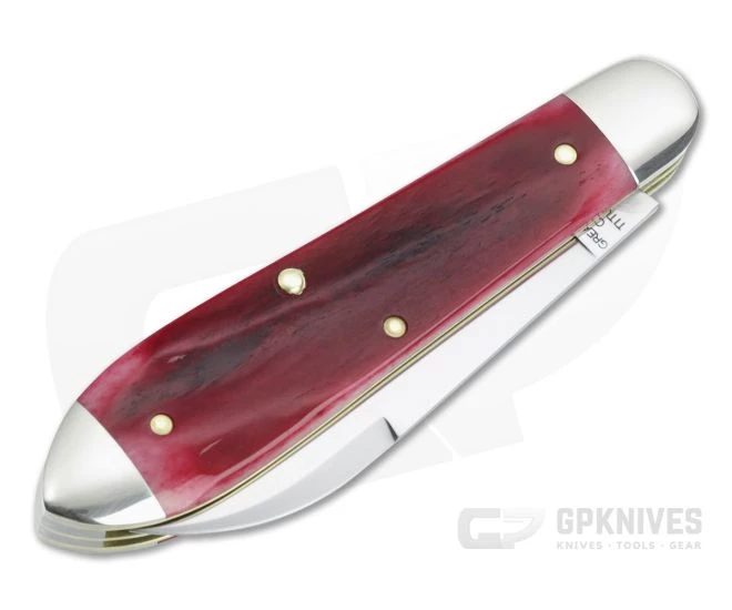 Handle: Flush fit between two polished nickel silver bolsters the cherry natural smooth bone scales offer a warm, organic feel in the hand with plenty of visual appeal. The pattern is eye catching with a bullet end mimicking the shape of the spear point blade. Brass liners and pins round out construction along with the Bottle shield.