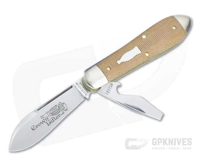 The #85 Crown Lifter is essentially a Bullet End Jack with a spear point blade paired with a bottle cap “crown” lifter. It retains the classic look and feel Great Eastern Cutlery is known for with solid fit and finish. This Tidioute Cutlery #85 comes with brushed nickel silver bolsters, satin blades and natural canvas Micarta covers.
