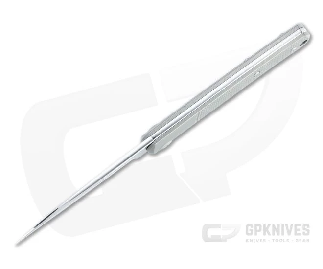 Handle:Â A crowned stainless steel back spring matches the spine of the blade and is fit securely between two slabs of contoured matte gray titanium with geometric texture milling. The handle design provides a secure, comfortable grip with good heft in the hand. Geometric crosshatch milling provides added traction and style, with two milled grooves forming a faux bolster as well. A hole at the pommel allows for lanyard attachment.